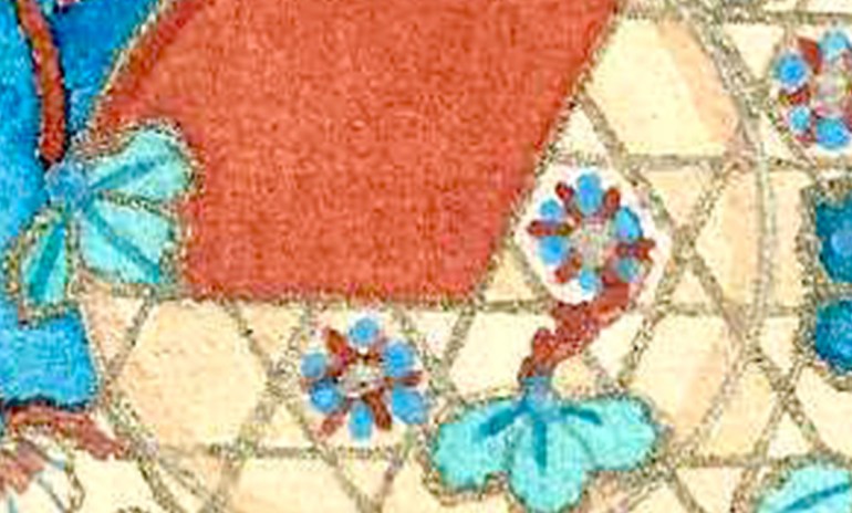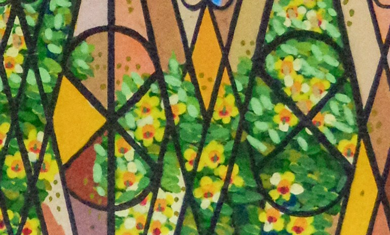 A intricate pattern of an iron gate overlays a colorful garden scene with potted plants and vines. The composition combines vibrant colors and geometric shapes, creating a visually captivating piece.