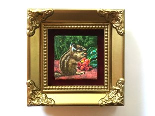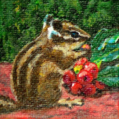 This painting I did with the aid of a magnifying glass and tiny brushes. The subject was derived from a photograph I took one Christmas. A chipmunk had gotten a hold of some holly I had put in a plant arrangement outside. This painting was entered in the Blick Mini Masterpiece Challenge.