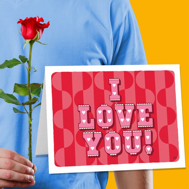 Get in the loving groove with this “I Love You!” Valentine. Alternating half-circle waves of pink and red lay atop stripes of the opposite color, creating a nostalgic feeling of 1960s carefree print. The words I love you are maroon, light pink, and white. Each letter has a drop shadow, white scalloped trim, and white hearts. Inside: Blank (Also available as a download on Zazzle.)