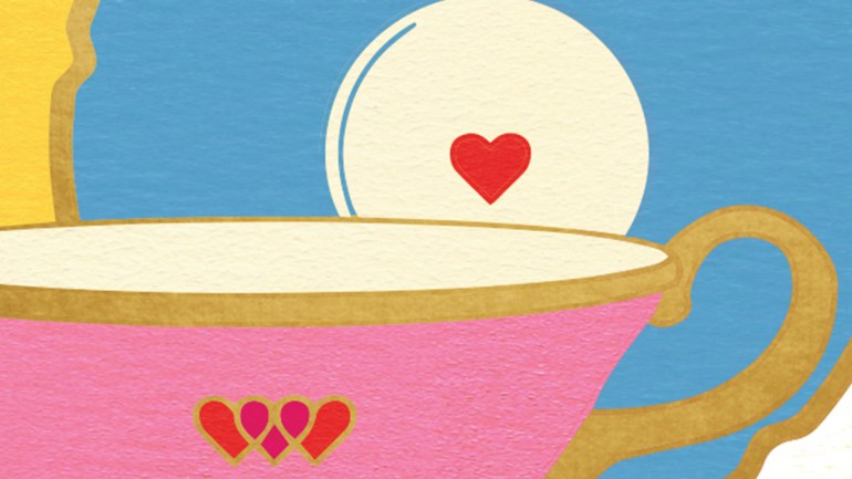 A fanciful tea party invitation. Your guests will be thrilled to receive an invitation in the mail for your fantastic party. The image has a story-tale frame of gold colors with the words Valentine Tea Party, hearts, a napkin, a teacup, and a saucer. Colors include magenta, gold, red, purple, blue, orange, yellow, pink, and cream. The back side is a template for you to customize with party details. (Also available as a download on Zazzle.)