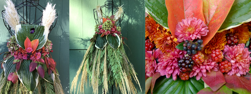 With these ideas in mind she set out to the forest to find her dress and came upon one later that day. Around the waist a brocade of small rust and purple chrysanthemums with blackberry and huckleberry beads. Fading hydrangea blossoms made up the bodice and a delicate pansy jewel button dotted the front.