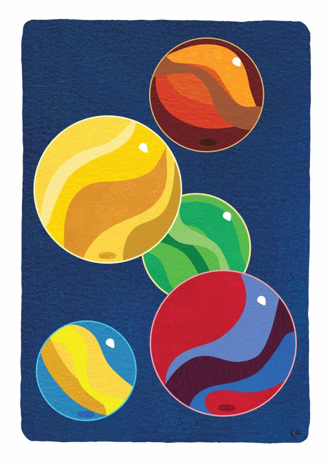Hi, I wanted to share this new illustration finished yesterday of glass marbles. Perfect orbs of color swirls. I hope they bring you joy.