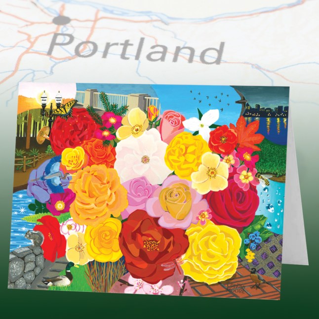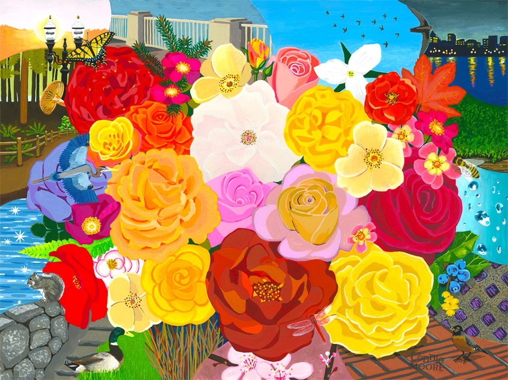 This image contains: roses of different types, the Waterfront Park Trail, the Willamette River, a native white trillium, swifts in flight, downtown city lights reflecting on the river, wood, moss, rain droplets, a bee, purple sidewalk prism glass, native Oregon Grape plant, Portland street bricks, a Robin, Waterfront Park Cherry tree blossoms, a red Dragonfly, Portland city protected wetlands, a male Mallard duck, a city park rock wall and stairs, a Gray squirrel, sunlight reflection on Fanno Creek, a wild Blue heron, rain forest pathway, Douglas fir trees, a mushroom, an Oregon Swallowtail butterfly, a Portland vintage streetlight, and the all too welcomed sunrise.